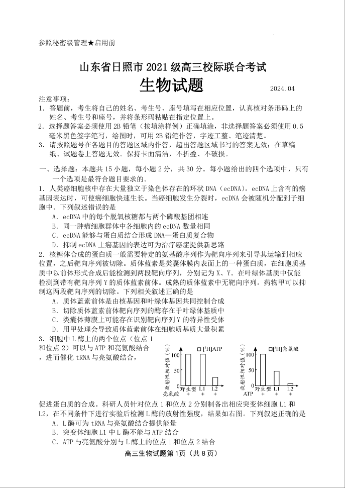 山东省日照市2024届高三下学期4月校际联合考试(日照二模)生物
