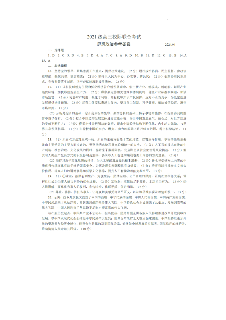 山东省日照市2024届高三下学期4月校际联合考试(日照二模)政治答案