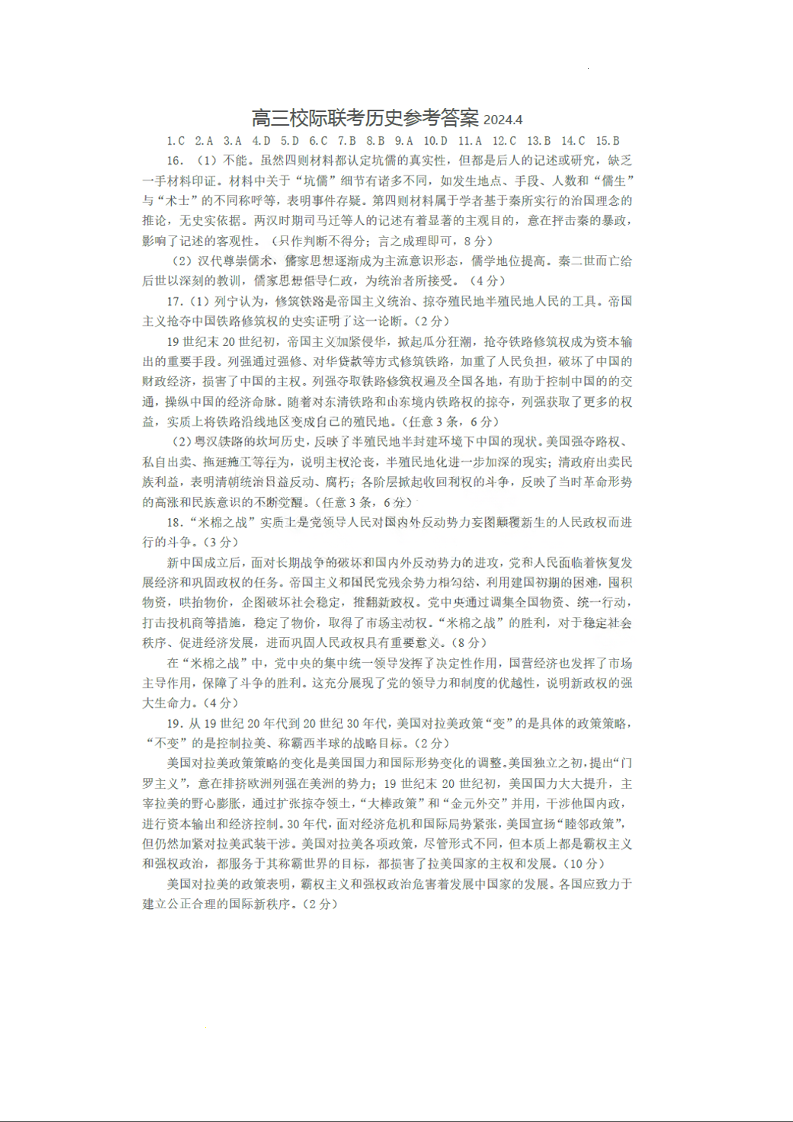 山东省日照市2024届高三下学期4月校际联合考试(日照二模)历史答案