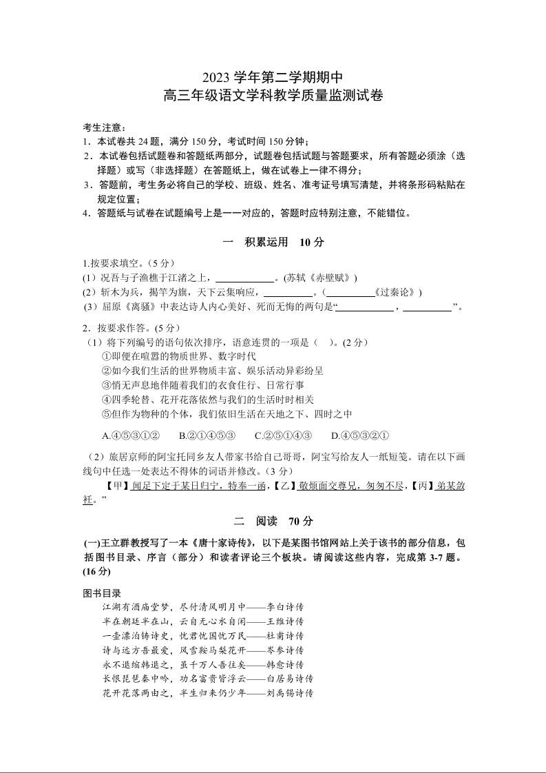 上海市宝山区2024届高三下学期二模语文+答案