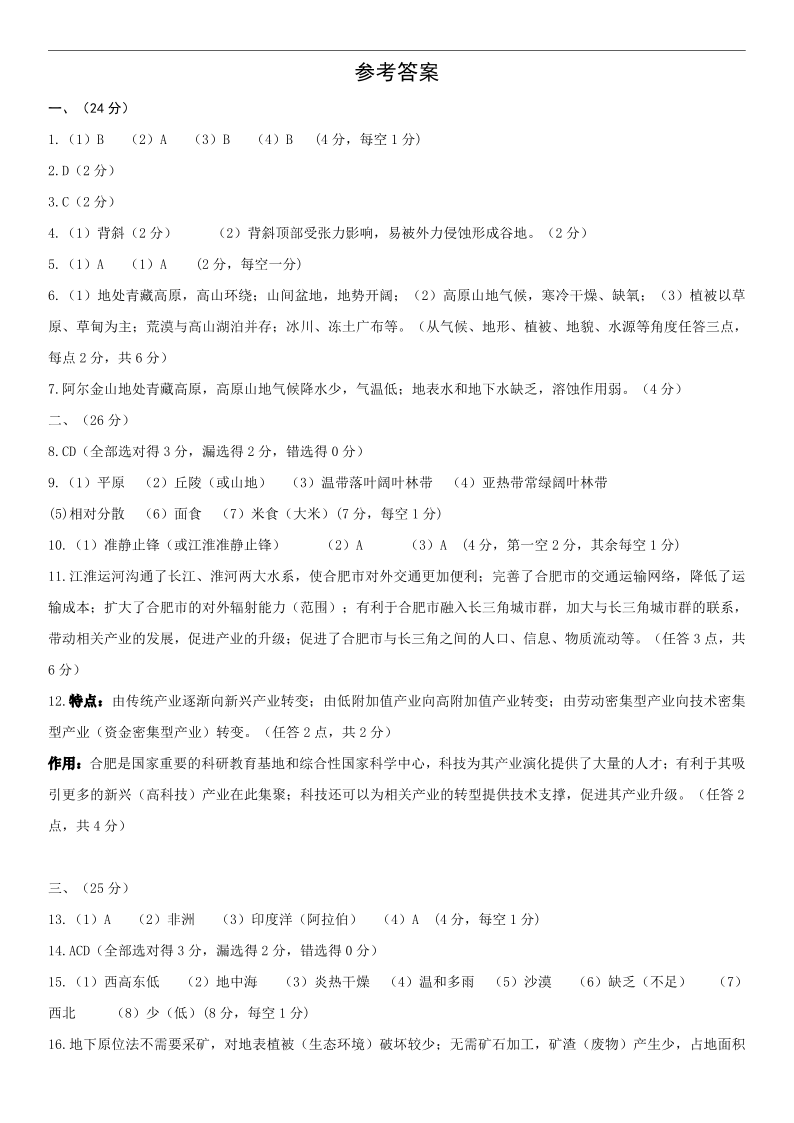 上海市浦东新区2024届高三二模地理答案