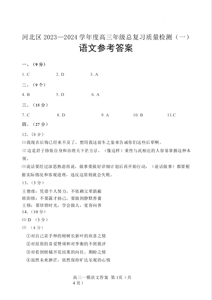 天津市河北区2024届高三下学期总复习质量检测(一)语文答案