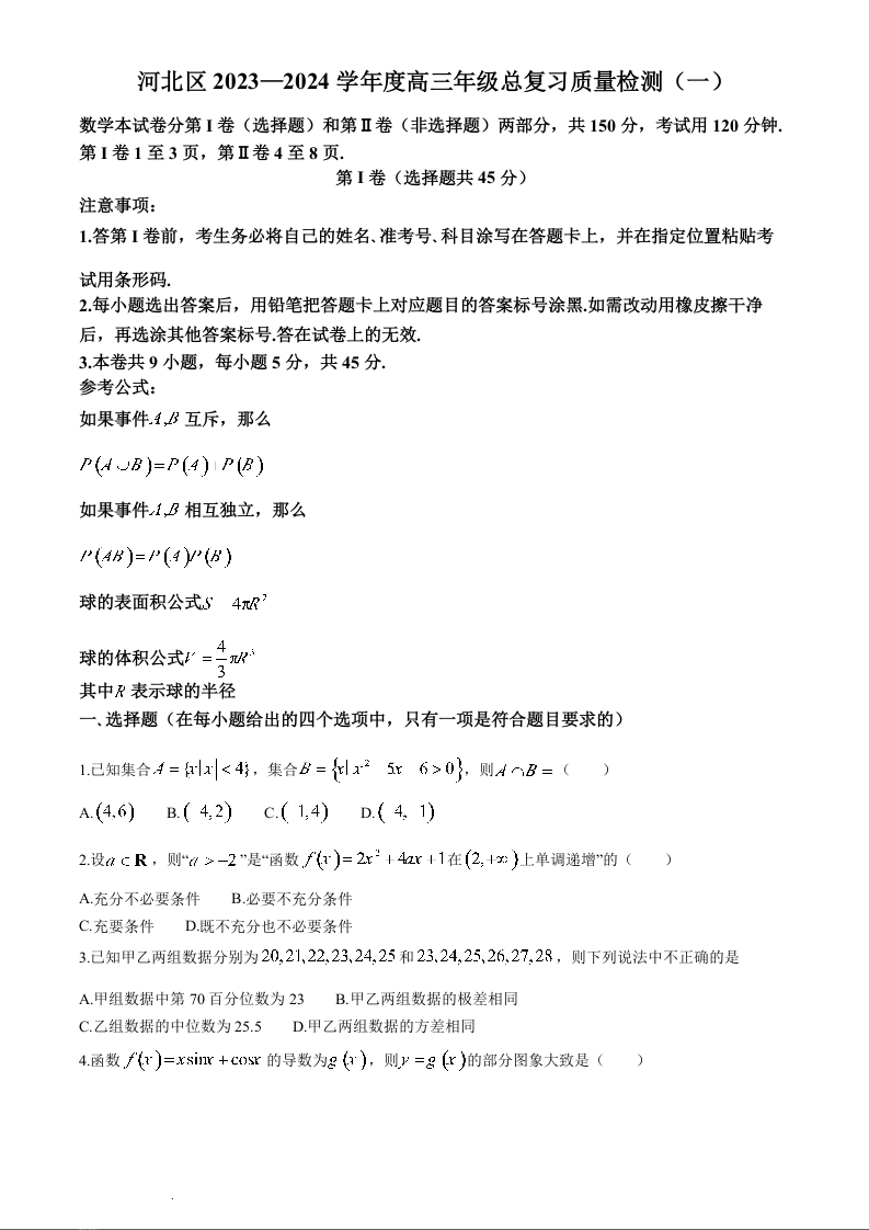 天津市河北区2024届高三下学期总复习质量检测(一)数学+答案