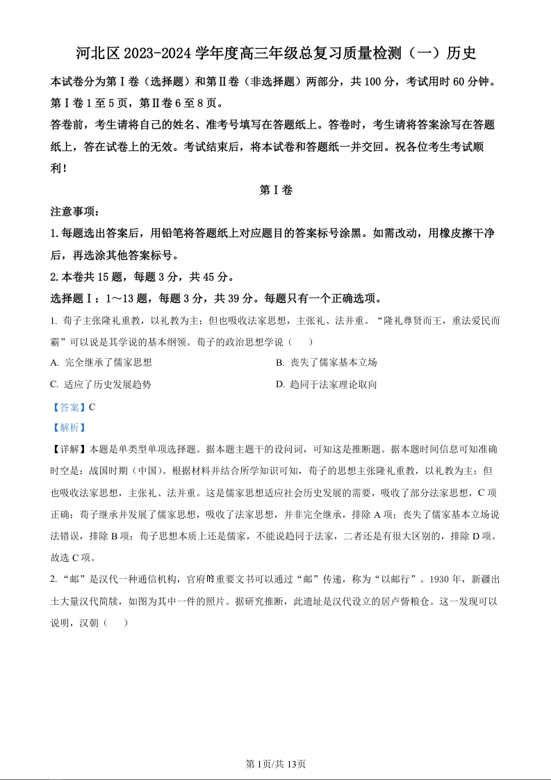 天津市河北区2024届高三下学期总复习质量检测(一)历史(精品解析版)