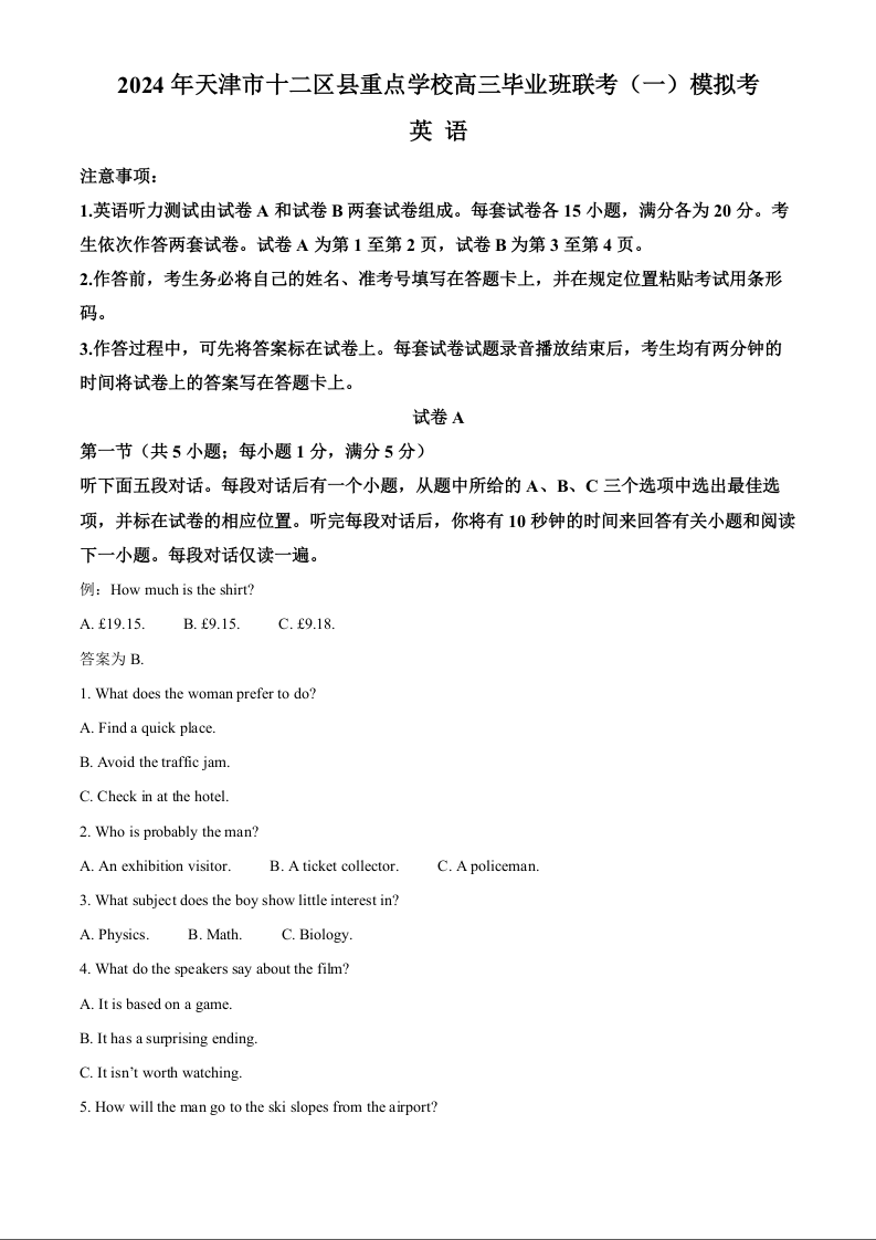 天津市十二区县重点校2024届高三下学期第一次模拟考试英语+答案