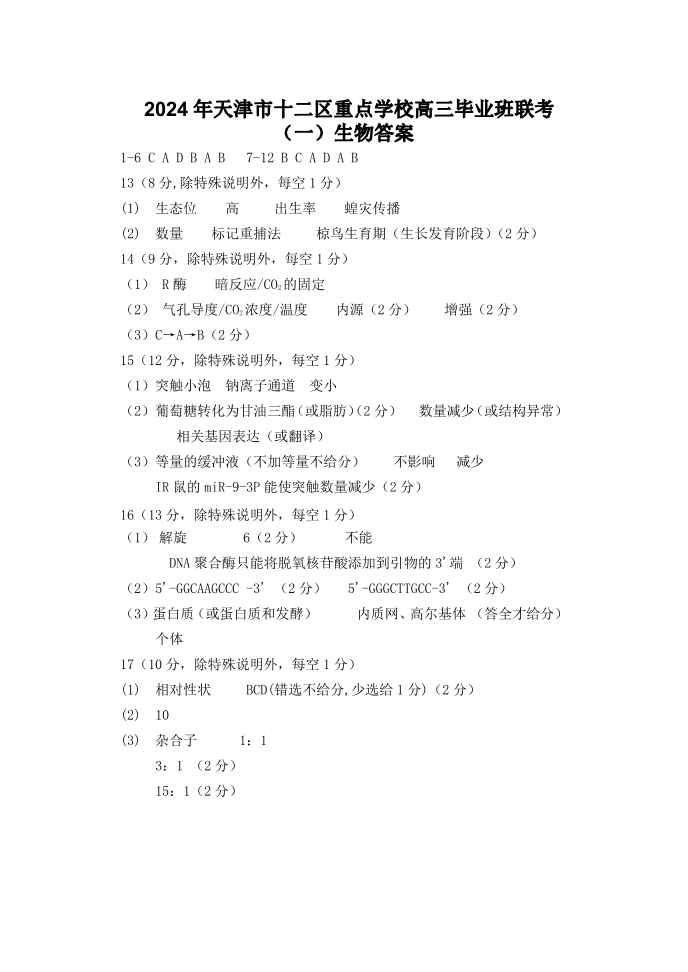 天津市十二区县重点校2024届高三下学期第一次模拟考试生物答案