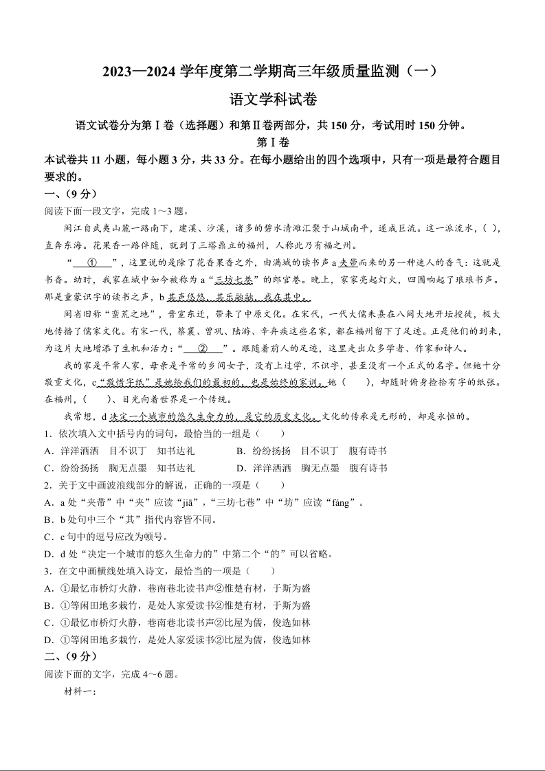 天津市南开区2024届高三下学期一模语文+答案