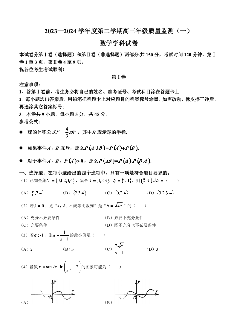 天津市南开区2024届高三下学期一模数学+答案