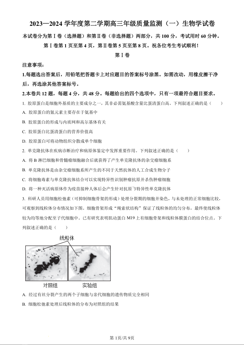天津市南开区2024届高三下学期一模生物(原卷版)