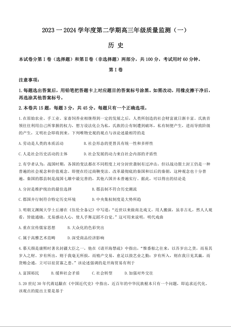天津市南开区2024届高三下学期一模历史+答案