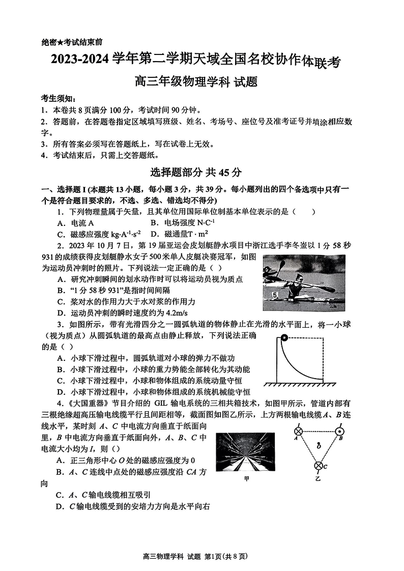 天域全国名校协作体2024届高三下学期4月联考物理
