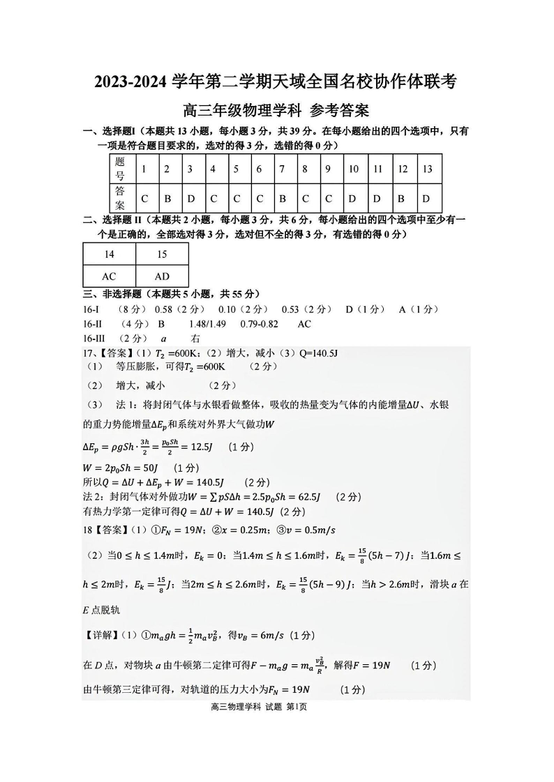 天域全国名校协作体2024届高三下学期4月联考物理答案