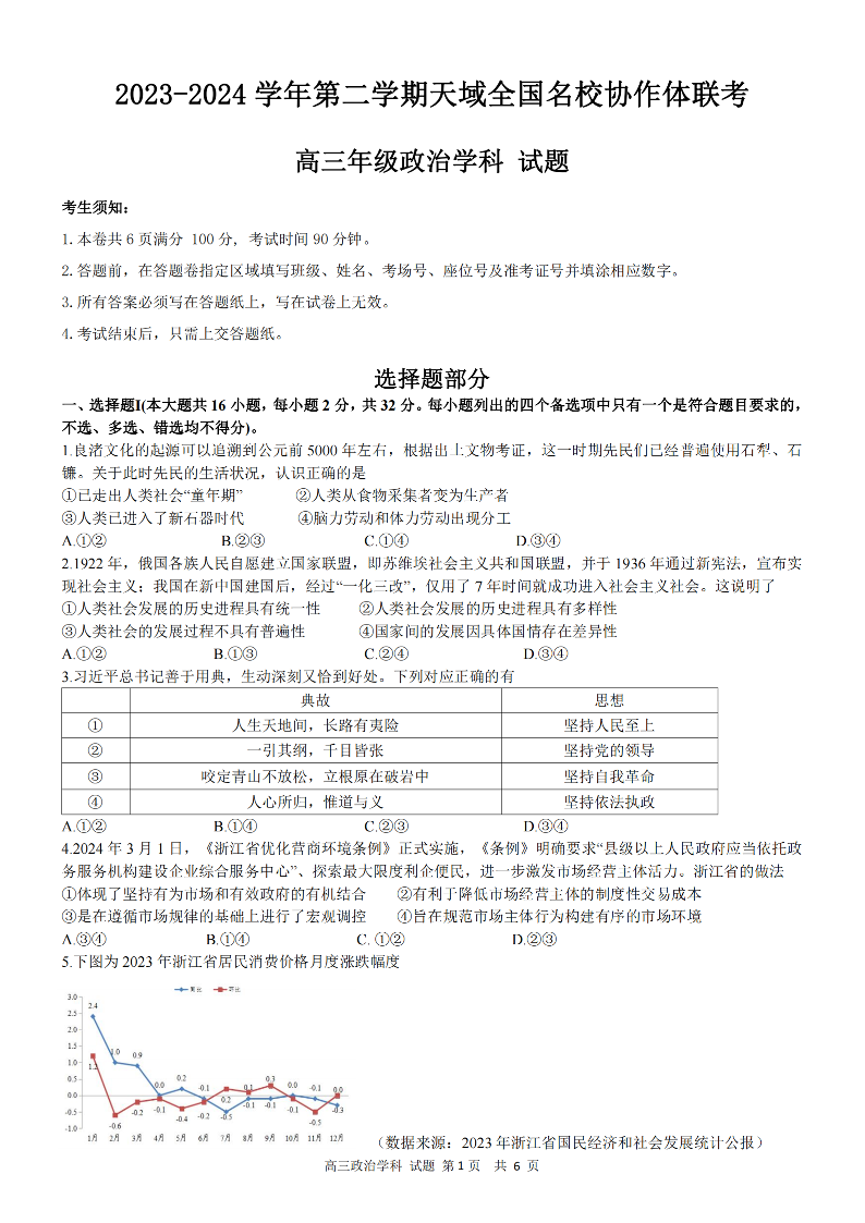 天域全国名校协作体2024届高三下学期4月联考政治