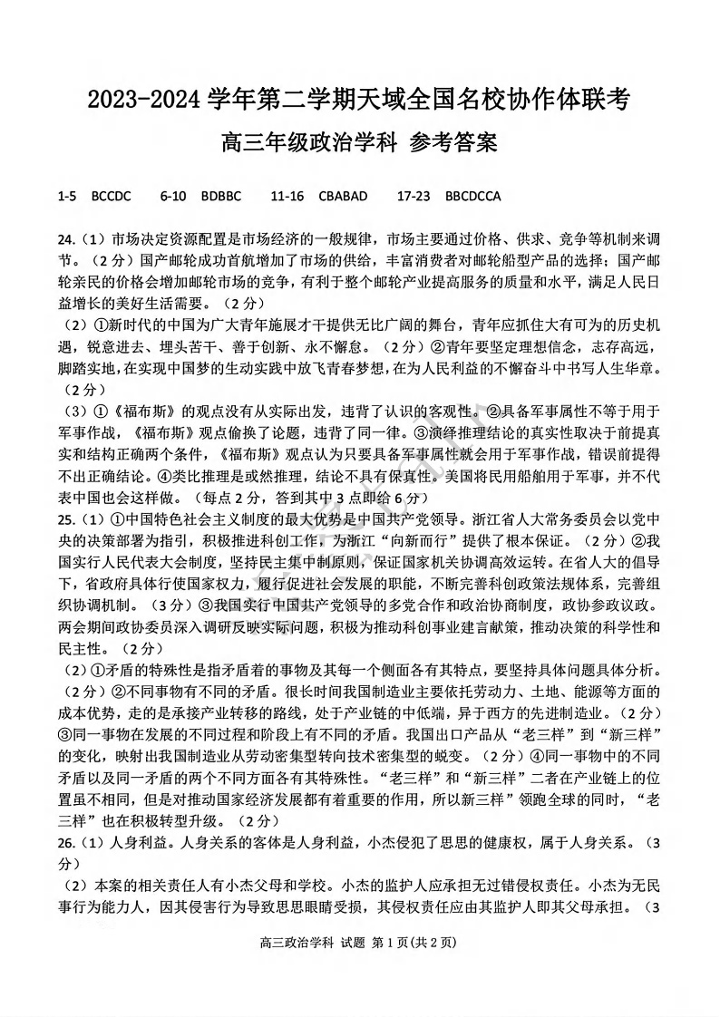 天域全国名校协作体2024届高三下学期4月联考政治答案