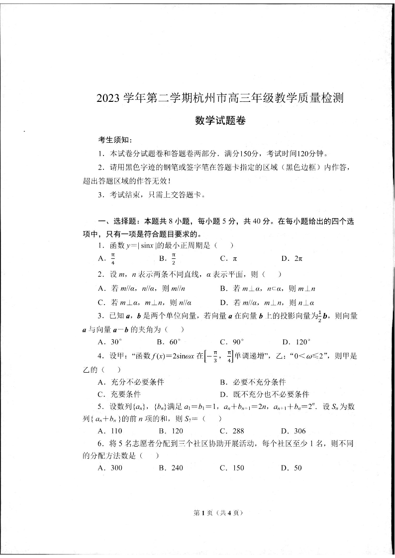 浙江省杭州市2024届高三年级教学质量检测(杭州二模)数学