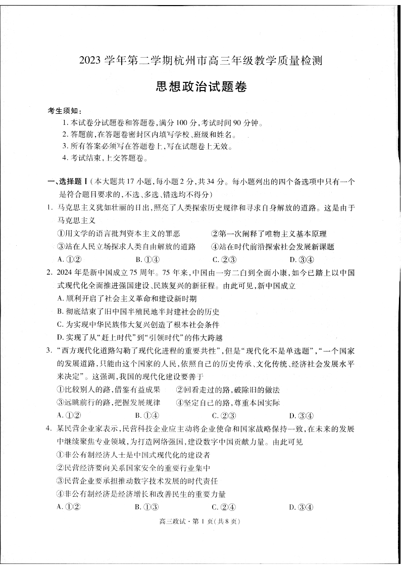 浙江省杭州市2024届高三年级教学质量检测(杭州二模)政治