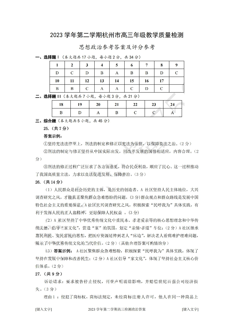 浙江省杭州市2024届高三年级教学质量检测(杭州二模)政治答案