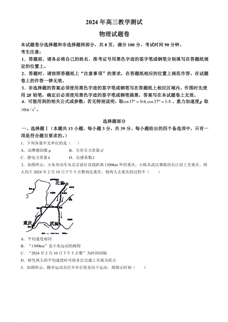 浙江省嘉兴市2024届高三下学期二模物理+答案