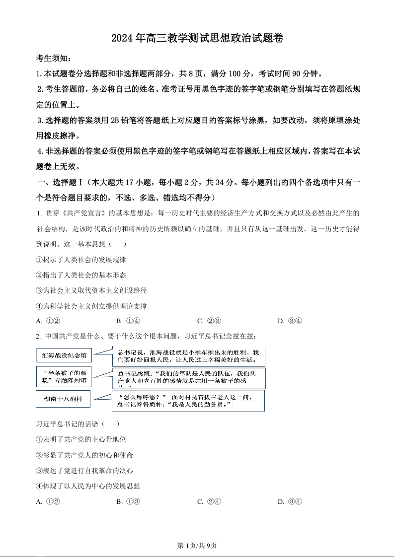浙江省嘉兴市2024届高三下学期二模政治(原卷版)