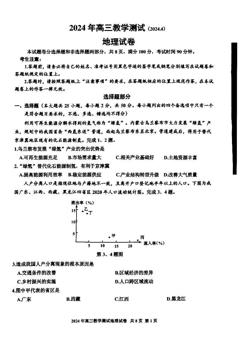 浙江省嘉兴市2024届高三下学期二模地理+答案