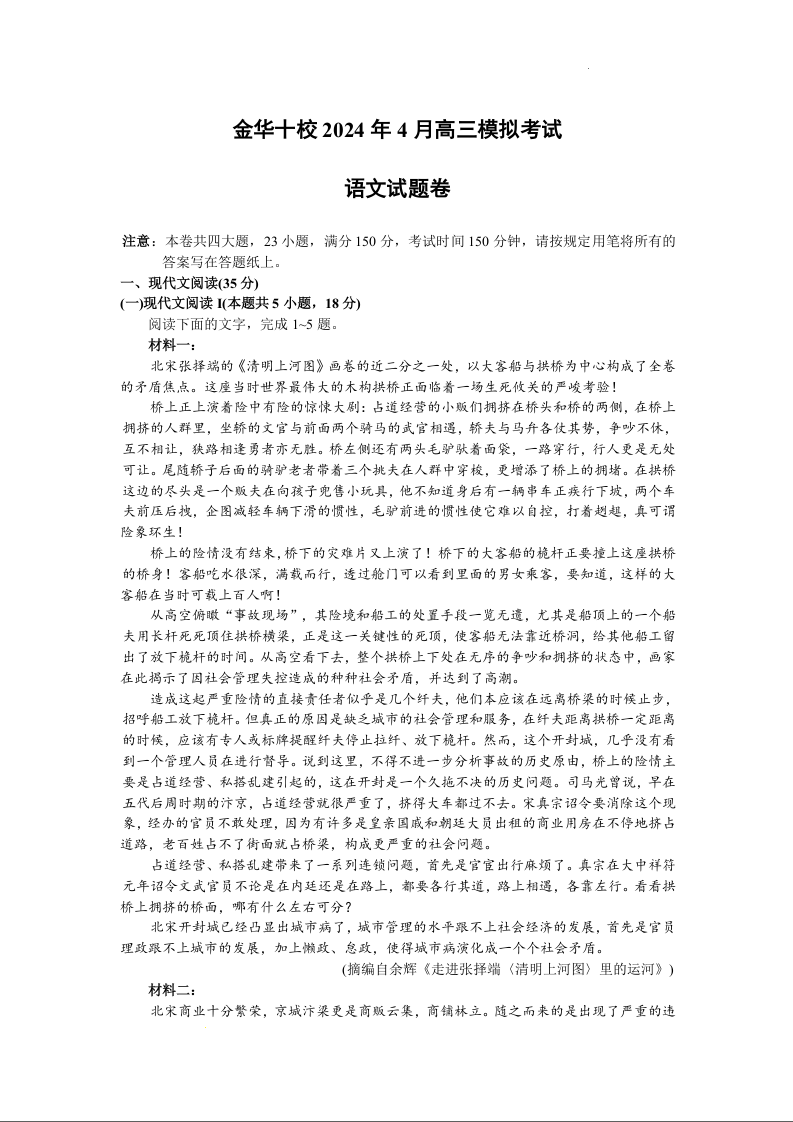 浙江省金华十校2024届高三下学期4月模拟考试(二模)语文
