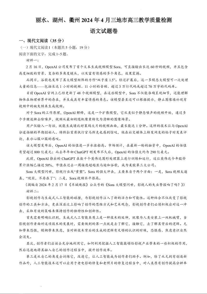 浙江省丽水、湖州、衢州三地市2024届高三下学期4月二模语文+答案