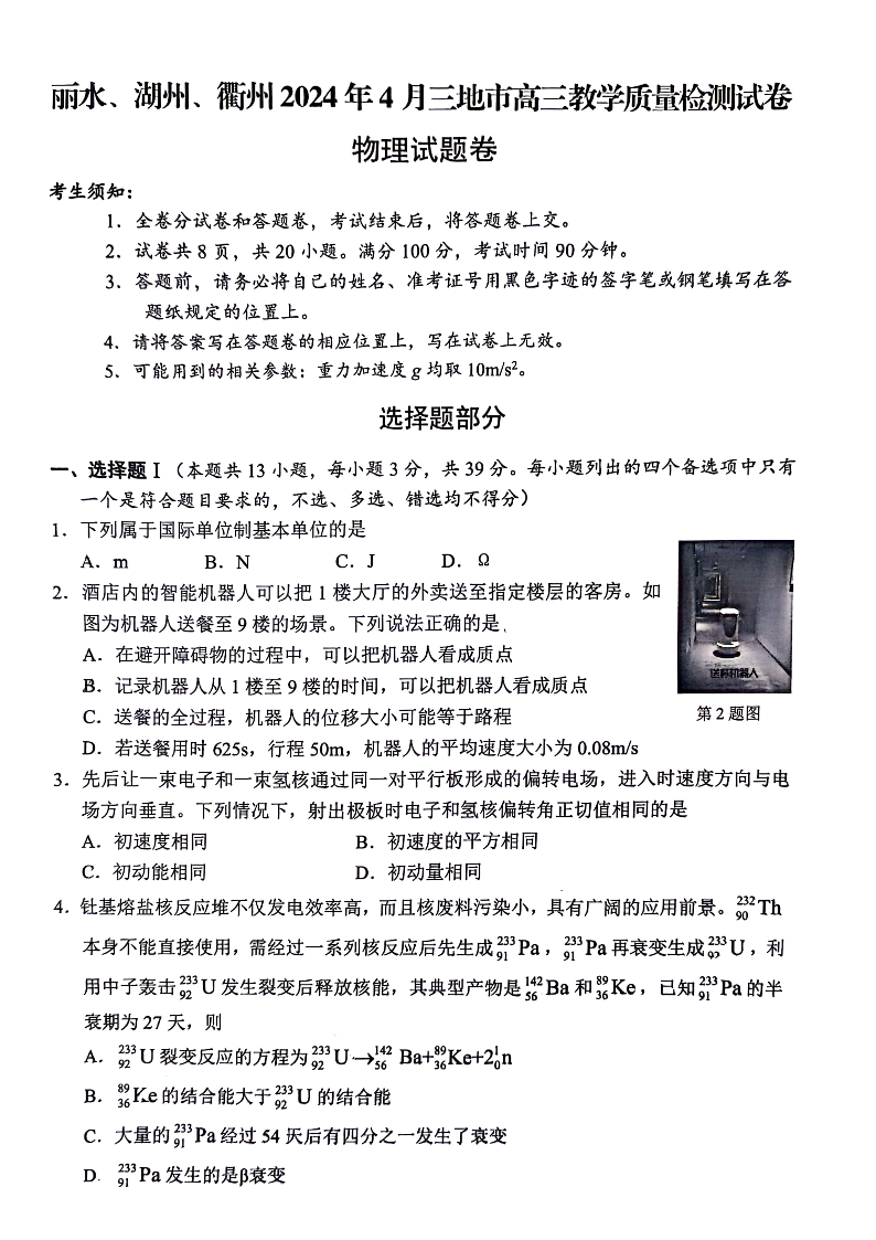 浙江省丽水、湖州、衢州三地市2024届高三下学期4月二模物理+答案
