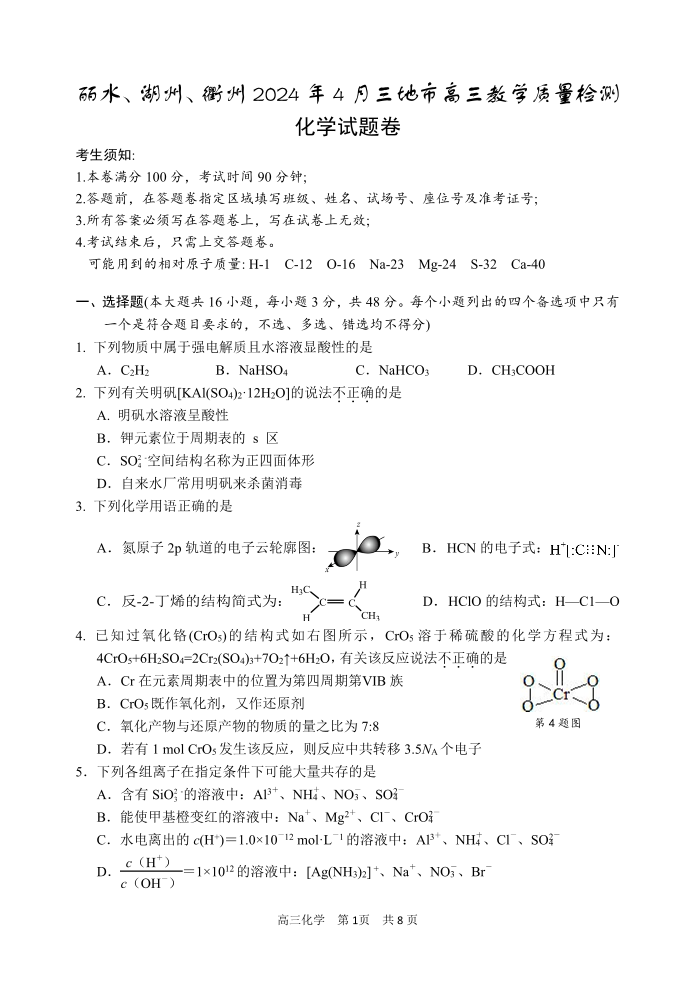 浙江省丽水、湖州、衢州三地市2024届高三下学期4月二模化学