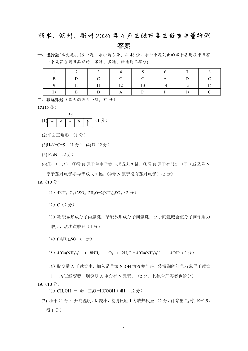 浙江省丽水、湖州、衢州三地市2024届高三下学期4月二模化学答案