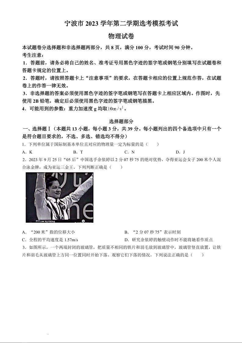 浙江省宁波市2024届高三下学期二模物理+答案