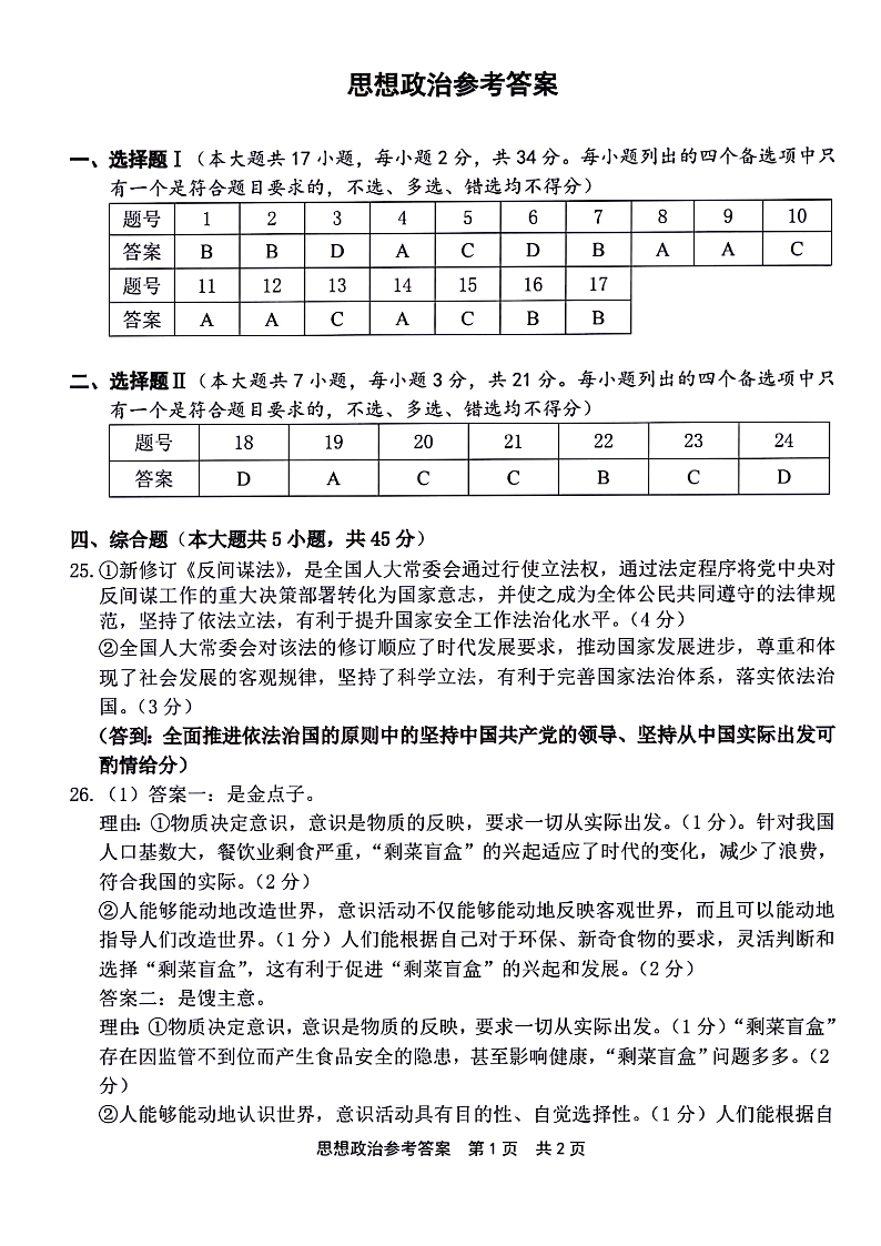 浙江省宁波市2024届高三下学期二模政治答案