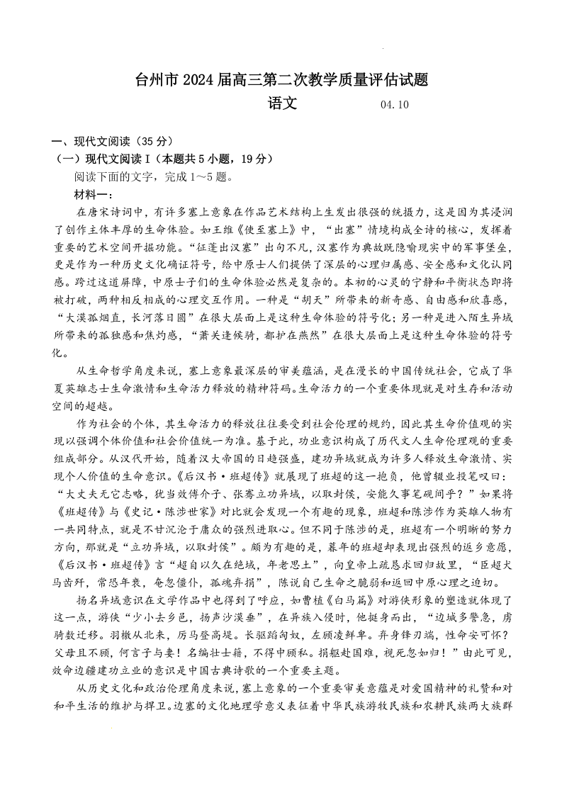 浙江省台州市2024届高三下学期4月二模语文+答案