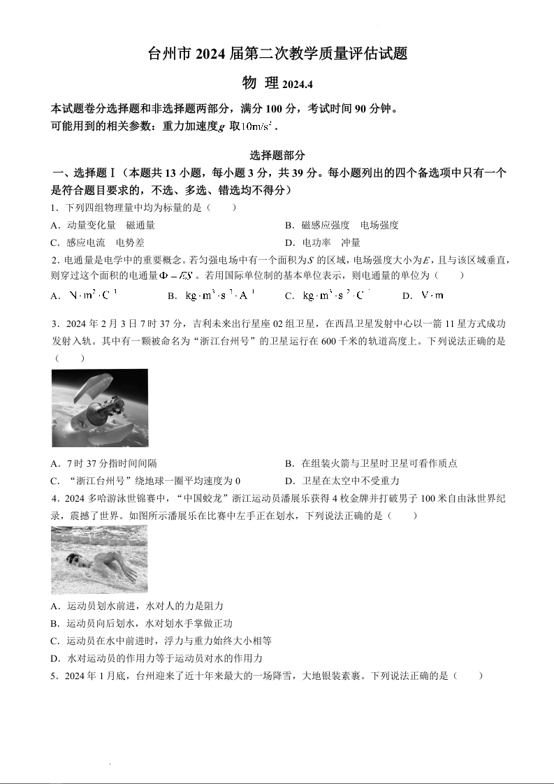浙江省台州市2024届高三下学期4月二模物理+答案