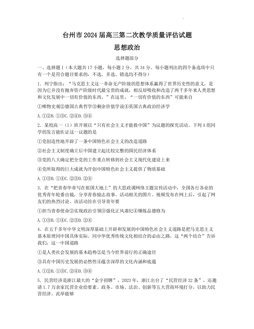 浙江省台州市2024届高三下学期4月二模政治+答案