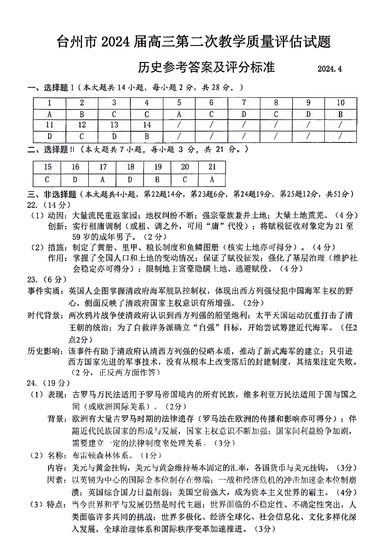 浙江省台州市2024届高三下学期4月二模历史答案