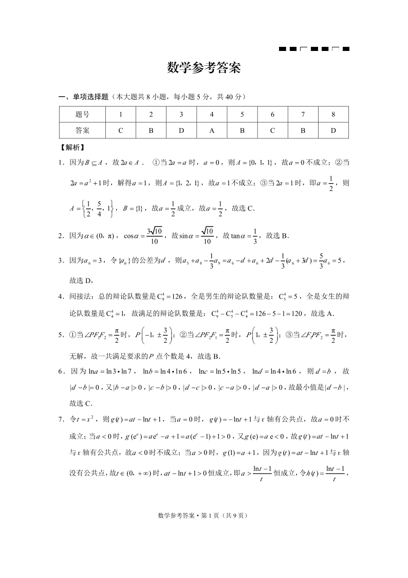 重庆市巴蜀中学2024届高考适应性月考卷(八)数学答案