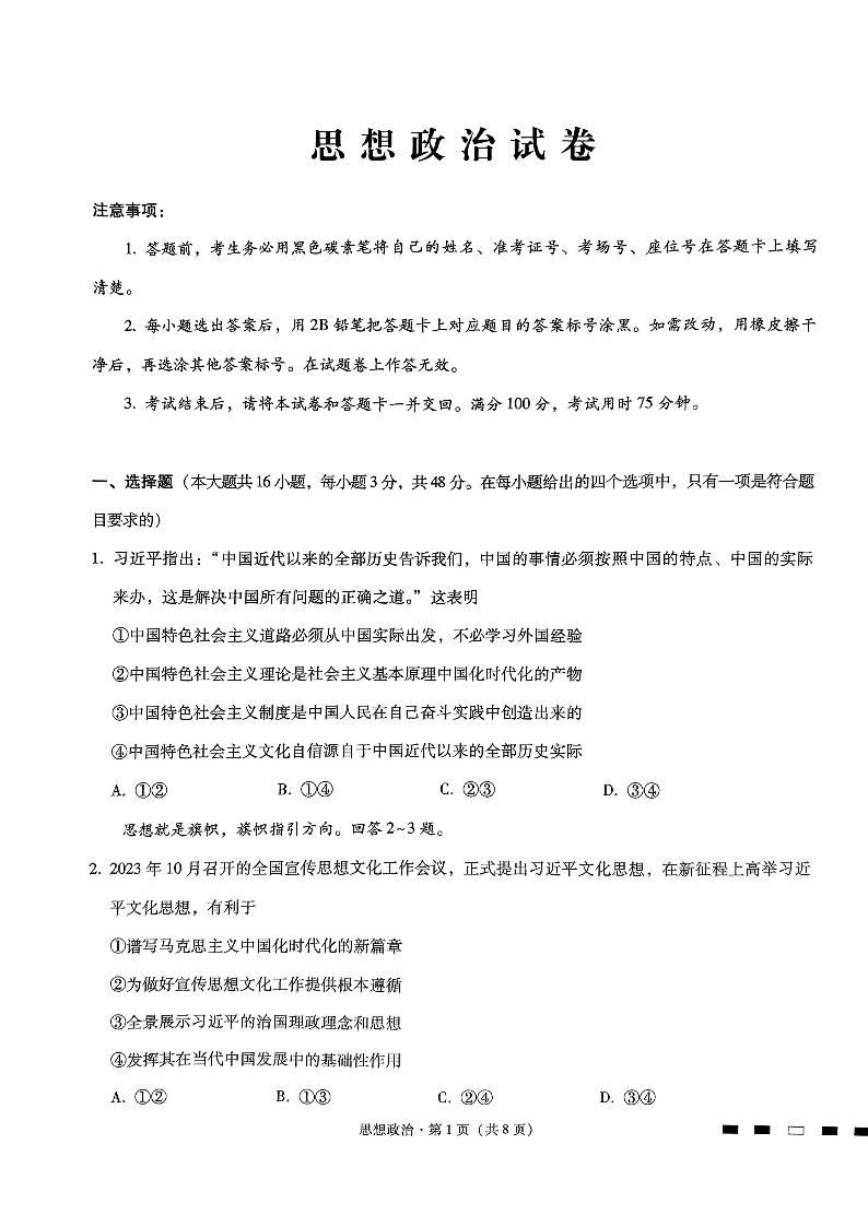 重庆市巴蜀中学2024届高考适应性月考卷(八)政治