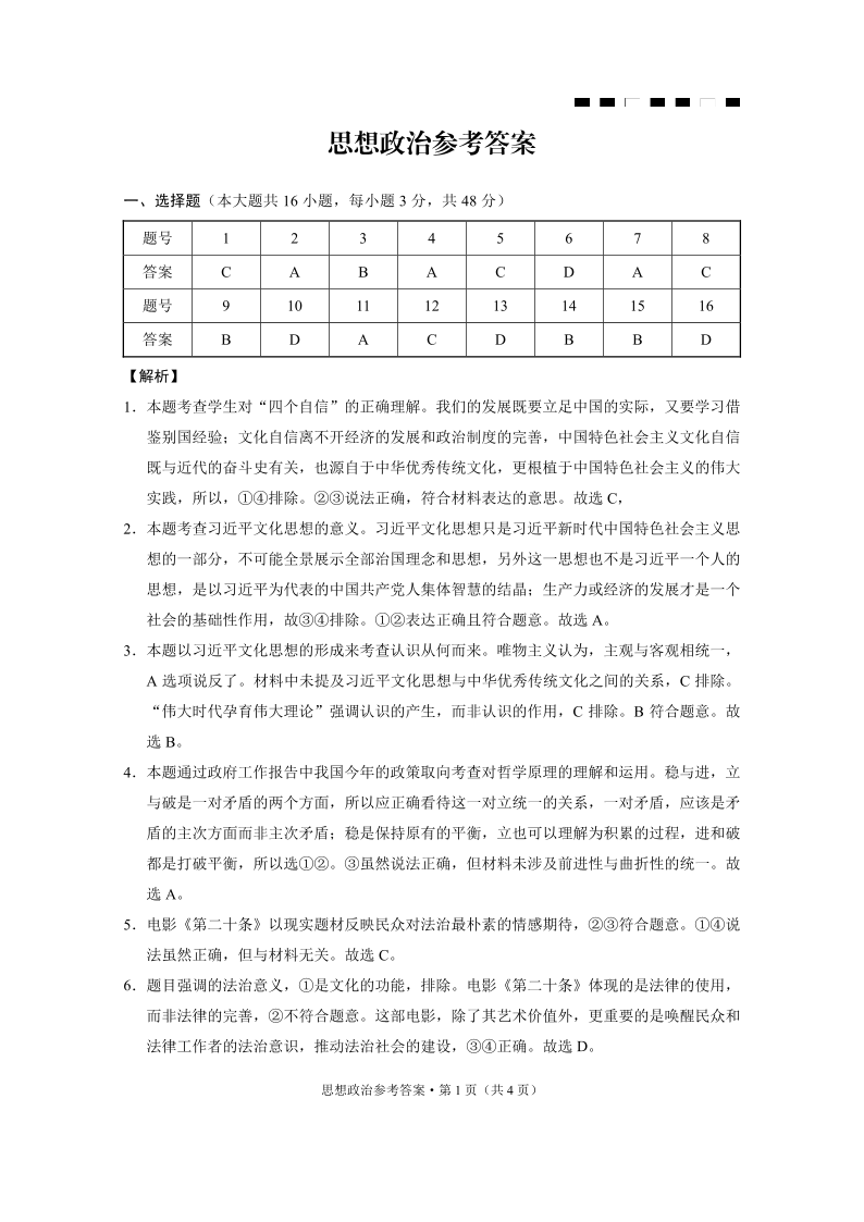 重庆市巴蜀中学2024届高考适应性月考卷(八)政治答案