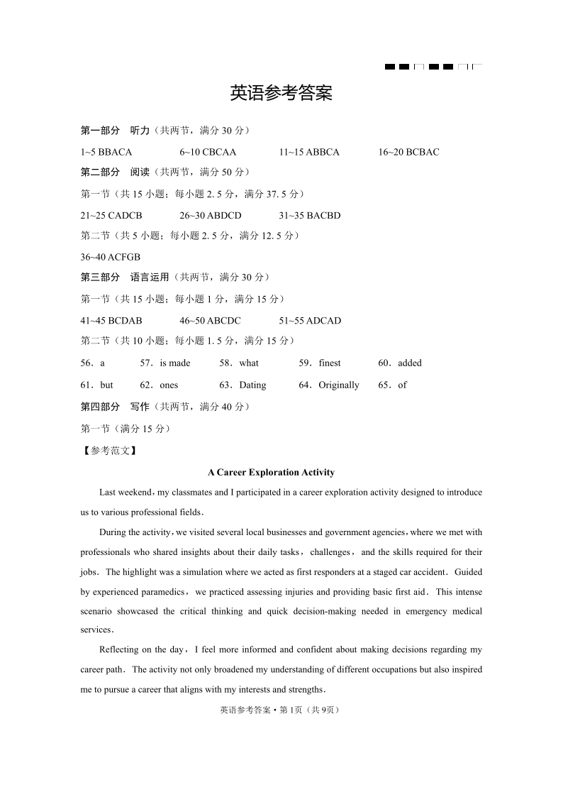 重庆市巴蜀中学2024届高考适应性月考卷(九)英语答案