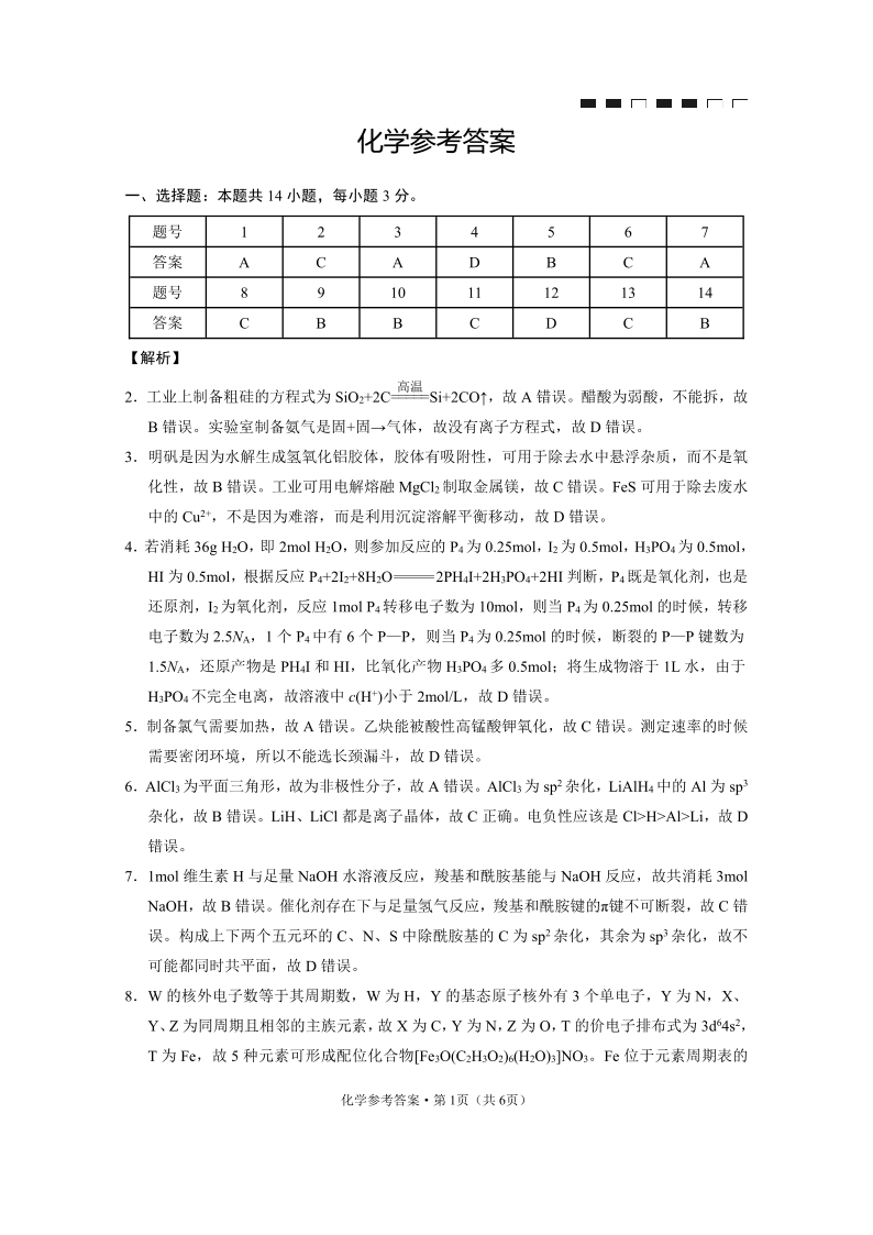 重庆市巴蜀中学2024届高考适应性月考卷(九)化学答案