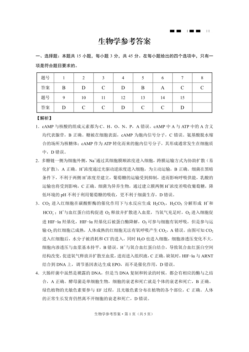 重庆市巴蜀中学2024届高考适应性月考卷(九)生物答案