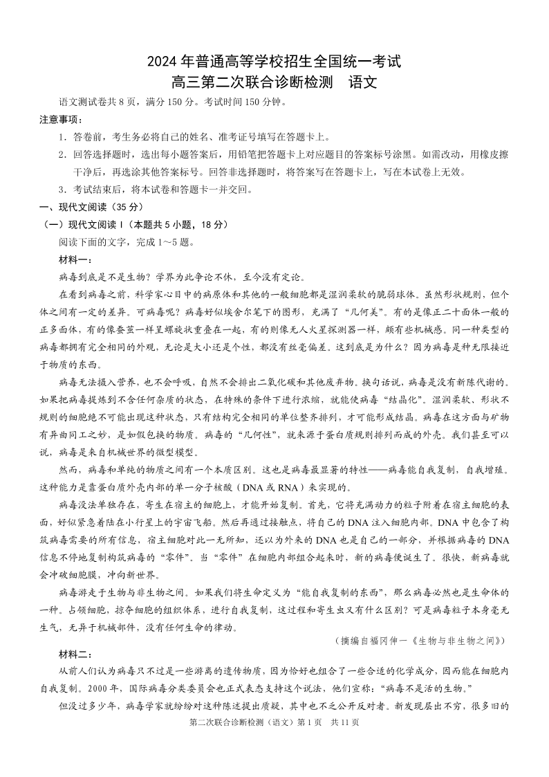 重庆康德二诊2024年普通高等学校招生全国统一考试高三第二次联合诊断检(重庆二诊)语文