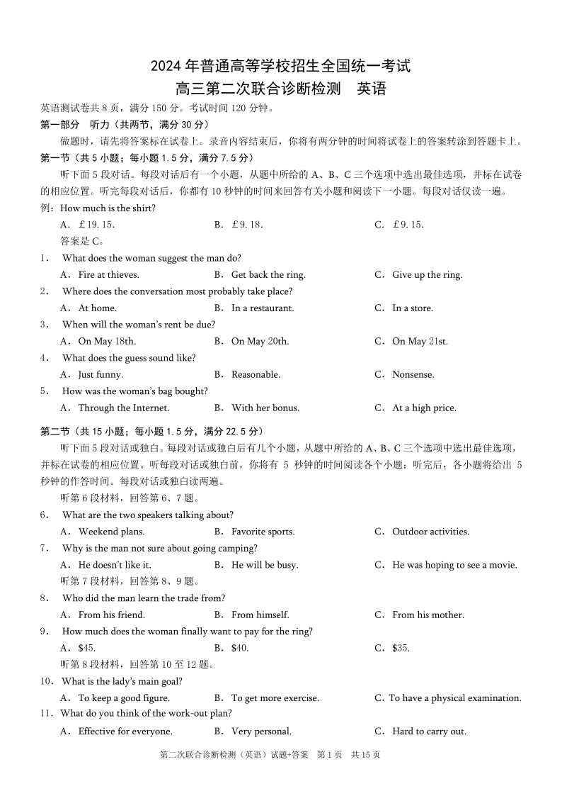 重庆康德二诊2024年普通高等学校招生全国统一考试高三第二次联合诊断检(重庆二诊)英语