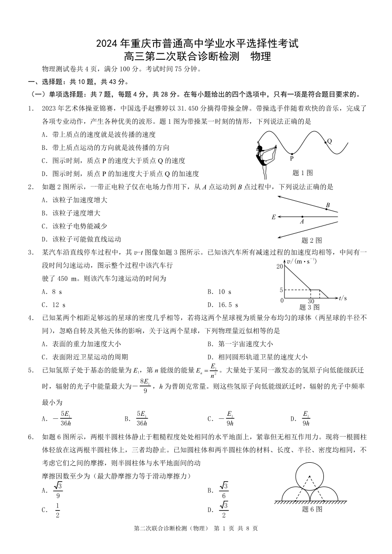 重庆康德二诊2024年普通高等学校招生全国统一考试高三第二次联合诊断检(重庆二诊)物理