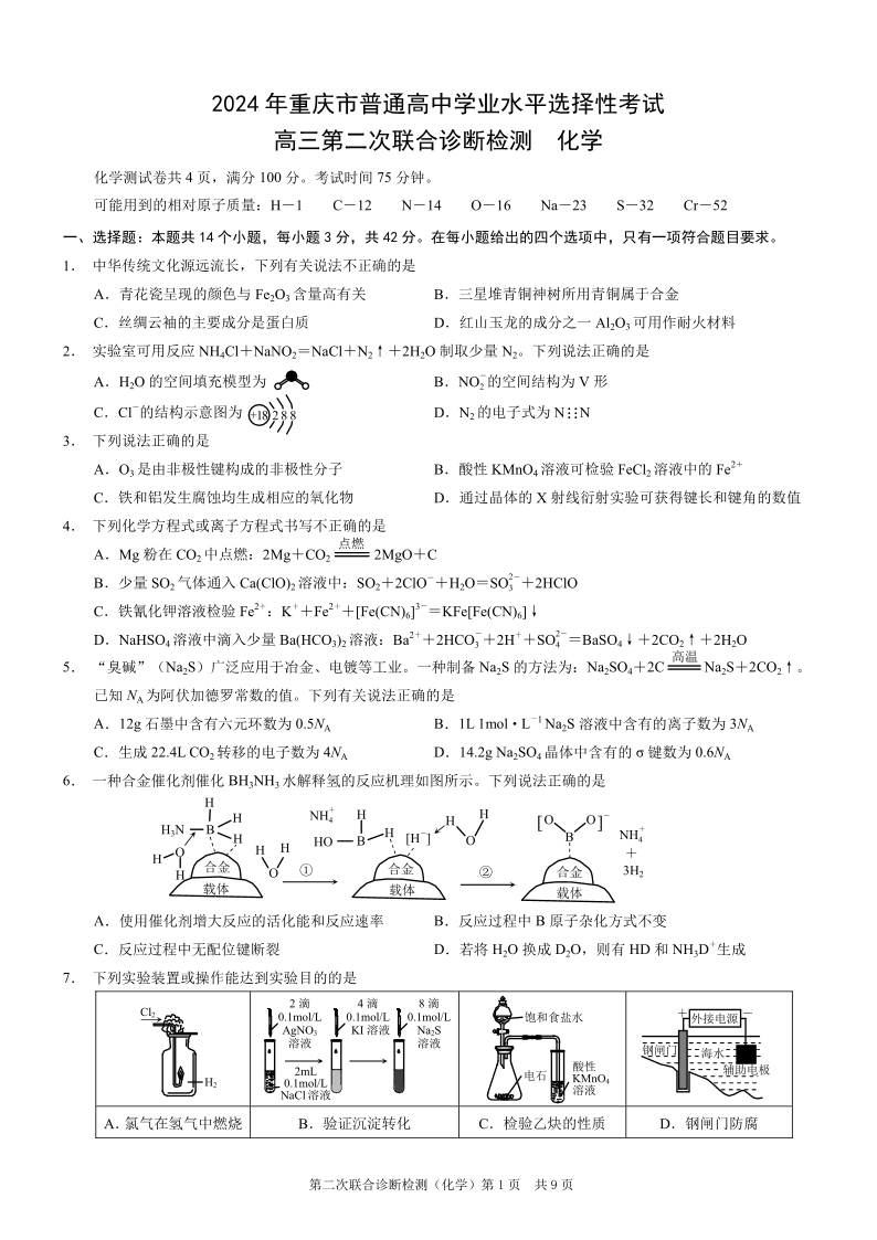 重庆康德二诊2024年普通高等学校招生全国统一考试高三第二次联合诊断检(重庆二诊)化学