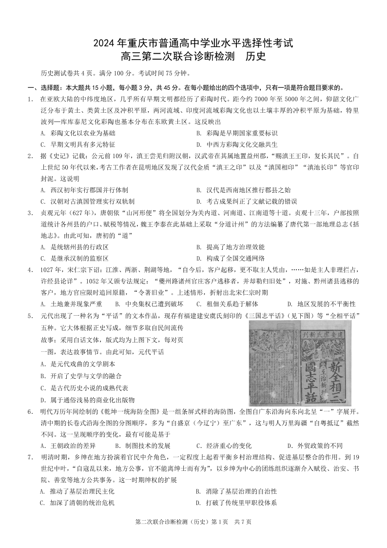 重庆康德二诊2024年普通高等学校招生全国统一考试高三第二次联合诊断检(重庆二诊)历史