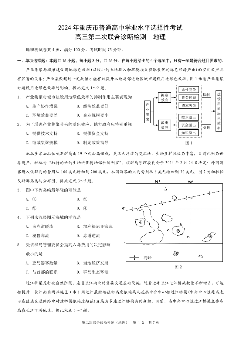重庆康德二诊2024年普通高等学校招生全国统一考试高三第二次联合诊断检(重庆二诊)地理