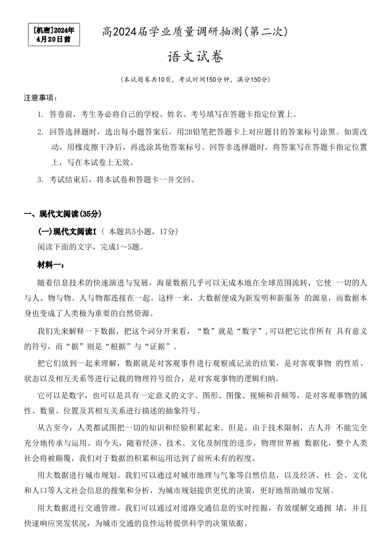 重庆市主城九龙坡区高2024届学业质量调研抽测(第二次)语文