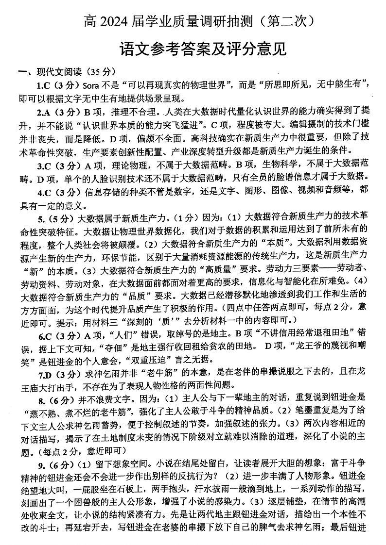 重庆市主城九龙坡区高2024届学业质量调研抽测(第二次)语文答案