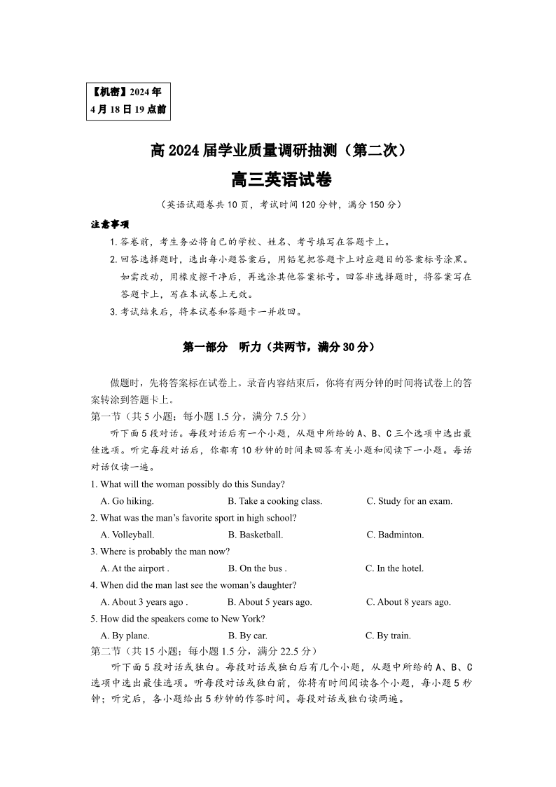重庆市主城九龙坡区高2024届学业质量调研抽测(第二次)英语